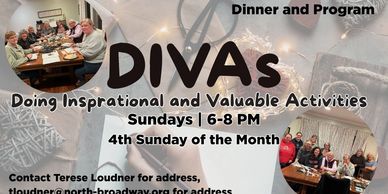 The DIVAs -- Doing Inspirational and Valuable Activities -- We are a group of woman who are perpetually "29" in spirit from all walks of life. Meet at someone ones house or church the 4th Monday of the month from 6-8pm for food, prayer, conversation and games/project.